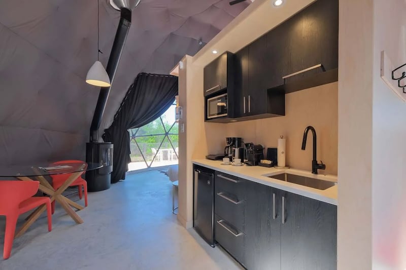 Le Bel Air Resort comprend des dômes de tailles et de design différents - nous avons pour notre part séjourné dans le Dôme Deluxe 1. D'une généreuse superficie de 30 pieds, on y retrouve un coin cuisine avec une table à manger, une salle de bain avec un bain autoportant, un lit King, un canapé design et un foyer à gaz.